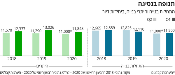 התחלות הבנייה ברבעון הראשון של 2020 צנחו בשיעור של 12.5% לעומת הרבעון הקודם, והסתכמו ב–11,500 דירות בלבד. אולם על פי ההערכות, השפל העמיק ברבעון השני של השנה — שהסתכם בכ–11,000 התחלות בנייה בלבד. מדובר בקצב בנייה של 43,000 דירות בשנה, שהוא נמוך בהרבה מתחזית הביקוש של הקבלנים לכ–70,000 דירות בשנה, או ליעד הממשלתי של כ–60,000 יחידות דיור בשנה.