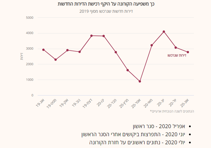בין ינואר לאוגוסט נמכרו 22,260 דירות, מספר הגבוה ב-1.5% מזה של המכירות שבוצעו בשמונת החודשים הראשונים של 2019. זאת על אף הסגר, שהוריד בחדות את מספר העסקאות בחודשים מרץ ובמיוחד באפריל. ואולם מיד לאחר שהסגר הסתיים, השוק התפרץ בחודשים מאי ובמיוחד ביוני, שבו כאמור נרשם שיא במכירת דירות חדשות. ביולי ובאוגוסט הואט קצב המכירות, אבל עדיין נותר גבוה מהממוצע לתקופה שלפני כן. הנתונים כאמור ארעיים, ואולם גם אם יעברו שינויים מסוימים, הם מפתיעים לאור משברי הקורונה הרפואית והקורונה הכלכלית שעוברים על המדינה.